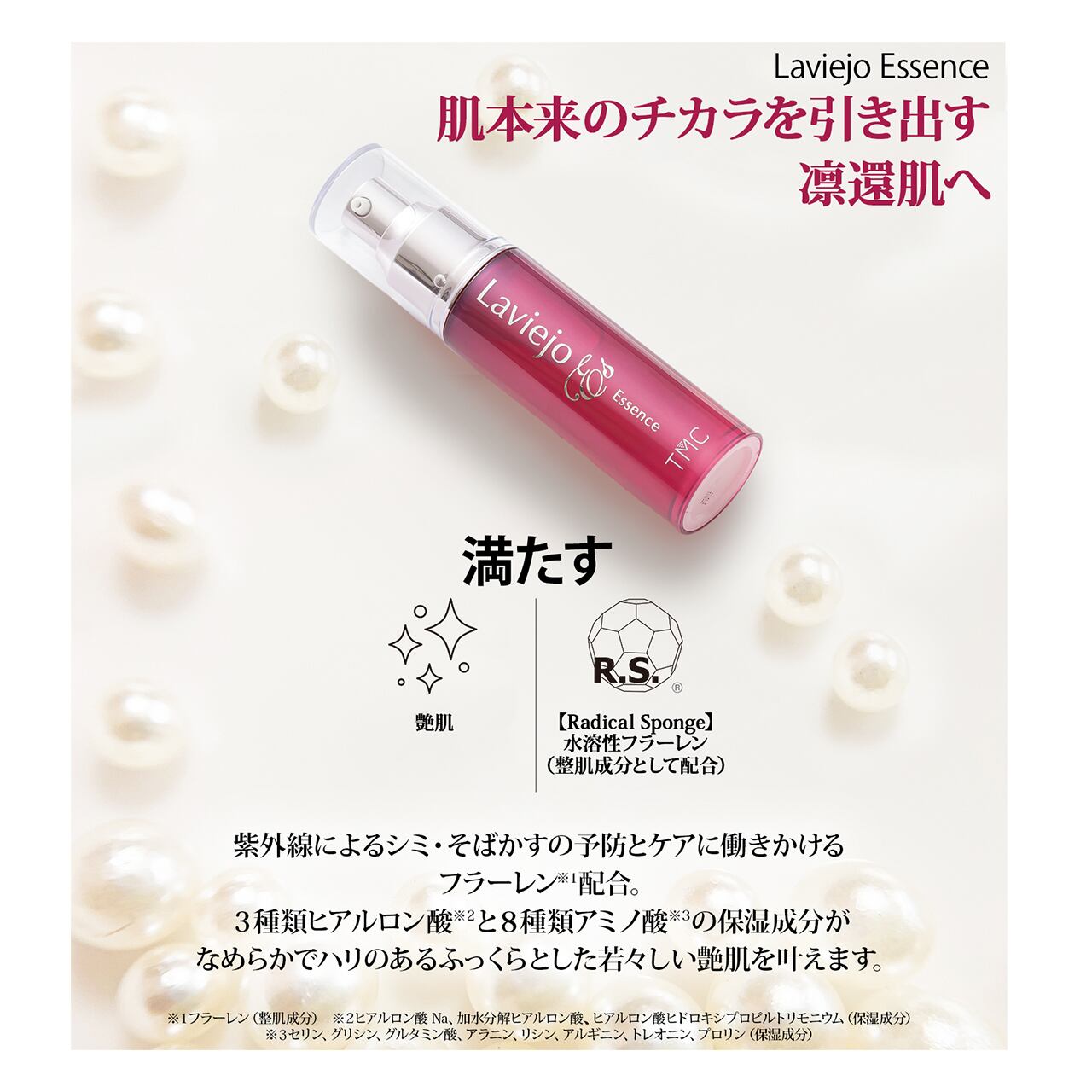 3種類のヒアルロン酸(※2)と8種類のアミノ酸(※3)の保湿成分がなめらかでハリのあるふっくらとした若々しい艶肌を叶えます。